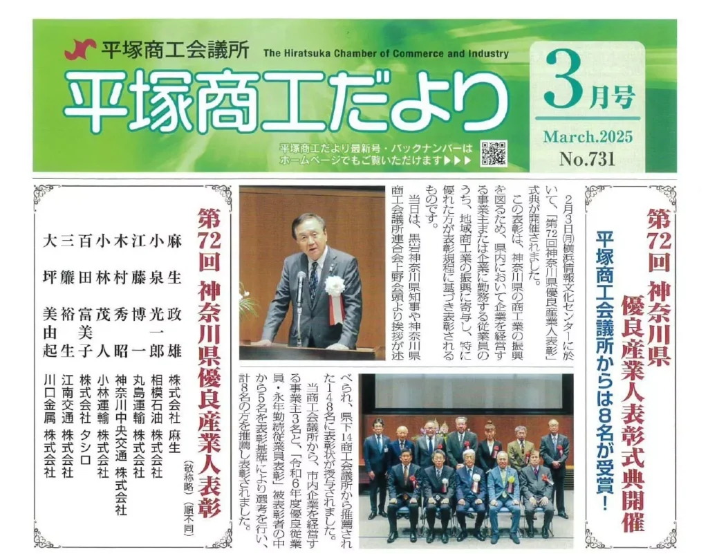 令和6年度第72回神奈川県優良産業人表彰にて生産管理課長の百田富美子が受賞したため、令和7年2月3日(月)に横浜情報文化センターにて開催された表彰式に参加いたしました。